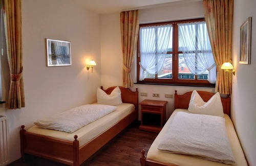 The house is in a quiet outskirts of the village, there are seven apartments in the house. The landlords live in the annex. A living room is comfortably furnished in a country house style, flat screen TV. DSL is possible. The apartment lights. Game on the first floor has two bedrooms for a maximum of 4 people. The first bedroom has two single beds, in the second bedroom a single bed and a sofa bed. In the living room there is the kitchenette with dishes, kettle, coffee machine, toaster, dishwasher and 2-burner electric stove. The balcony points to the north side and allows a view with a wonderful view of the valley. A small wellness area with relaxation room, experience shower, foot warming pool, sauna and steam bath is available to all guests free of charge at certain times (4:00 p.m. to 6:30 p.m.). The fitness room is permanently accessible, please not for children without supervision. Parking directly in front of the house. On request you can book breakfast or half board at the Hotel Zum Sonnenhof, 80 meters away. You can ask for prices directly there.