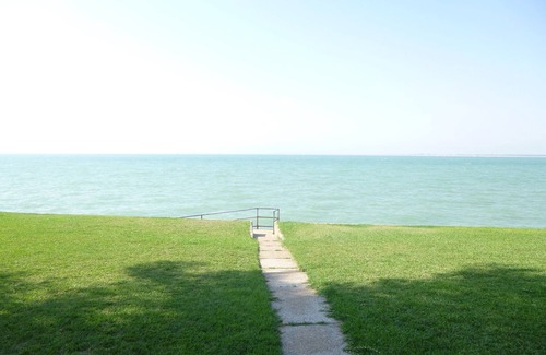 The main terrace gives way to a manicured lawn garden that merges with the sea.