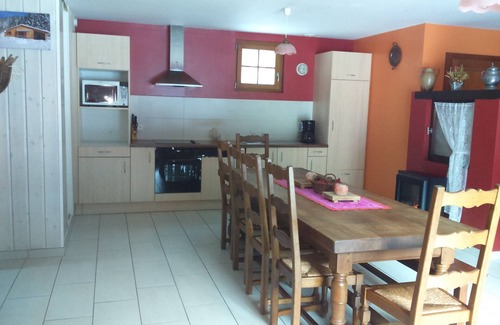 Living room of 40 m2 with kitchen integrated with all appliances, dishwasher, ceramic hob, oven, microwave, coffee maker, kettle, appliance pierrade, raclette, pancake, fondue, lounge with board games, Flat screen TV 111 cm TNT satellite, DVD player, 2 sofa beds 'TOP OF RANGE', electric fireplace.