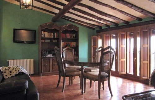 The Country House Casa Rural La Tahona is located in Lerín and boasts direct access to the ski slopes. The 900 m² property consists of a living room, a well-equipped kitchen, 9 bedrooms and 6 bathrooms and can therefore accommodate 27 people. Additional amenities include Wi-Fi, a TV, air conditioning, a washing machine as well as a dryer. Furthermore, a private sauna is available on the property. 3 high chairs and 3 baby cots are also available. This vacation rental features a private outdoor area with a whirlpool, garden, open terrace, 6 balconies, and a barbecue, perfect for relaxation and outdoor gatherings.