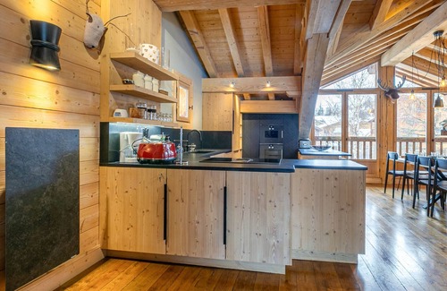 Elegant chalet, spacious and bright thanks to its large windows. Wonderful voulume under roof with visible wooden beams in the living room.